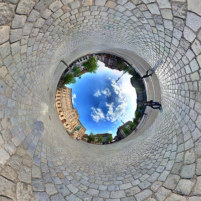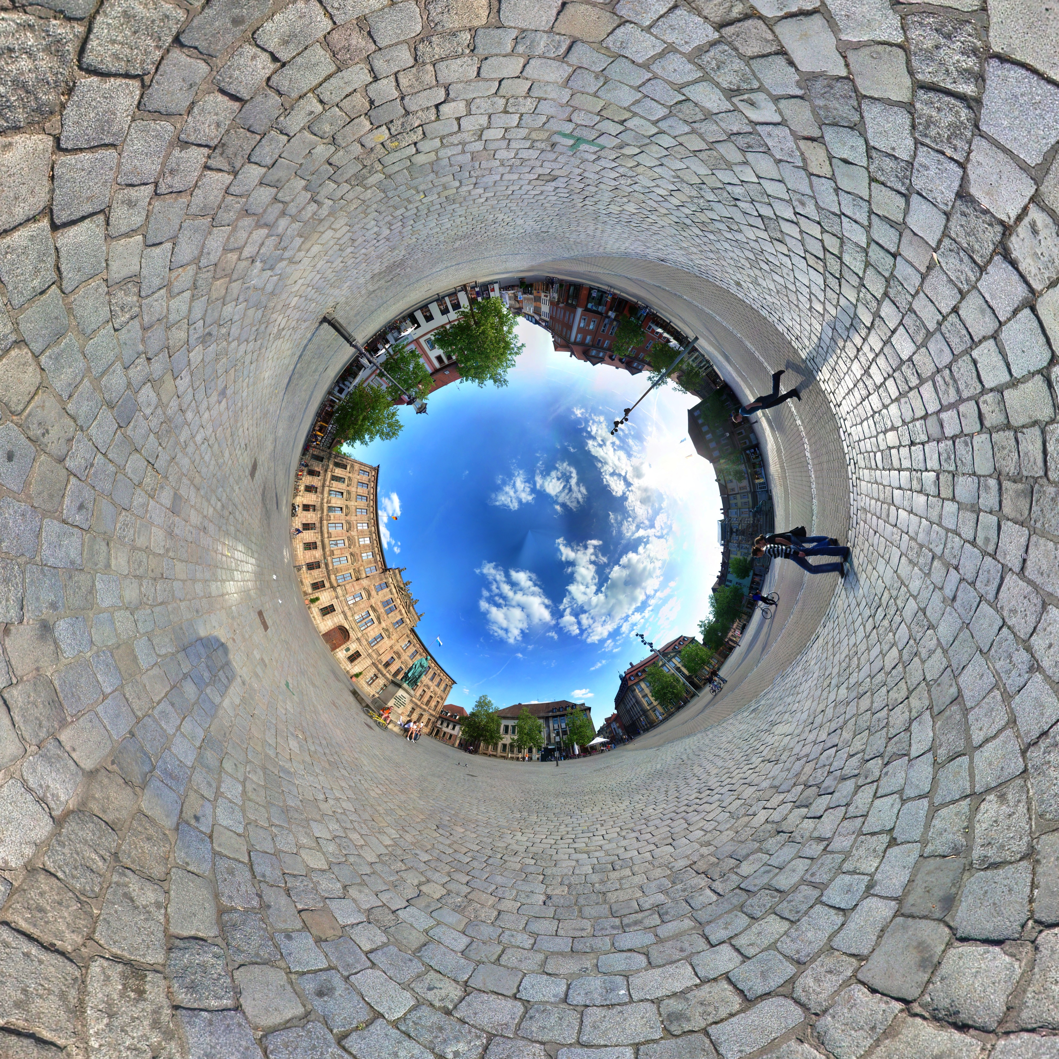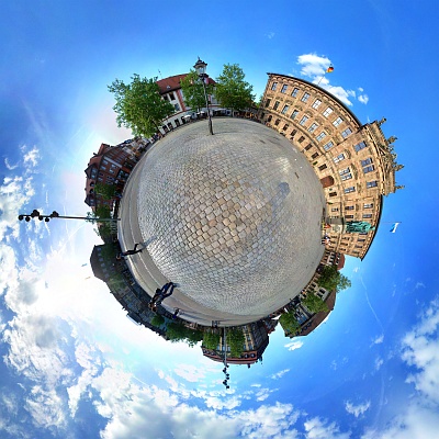 Zum Vergleich ein "little Planet" und ein "Tunnelblick" im Freien. Abgebildet ist der Erlanger Schlossplatz: